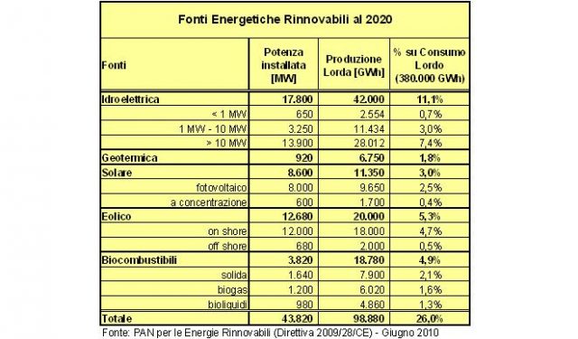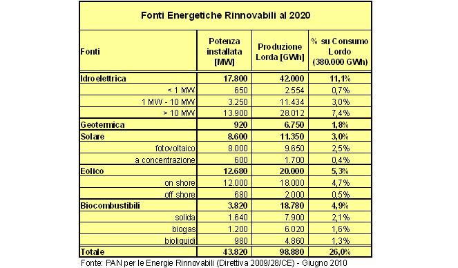 La produzione lorda di energia elettrica da fonti rinnovabili al 2020 è identificata in 98.880 GWh pari al 26% del Consumo Lordo (vedi tabella 1).