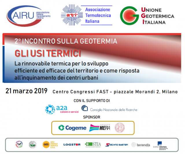 Il 21 marzo 2019, dalle 09,00 alle 17,30, si terrà al Centro Congressi FAST, P.le Morandi 2, Milano, il secondo incontro organizzato da UGI, ATI e AIRU, sugli usi termici della geotermia con titolo Un volano per lo sviluppo del territorio e una efficace risposta all’inquinamento dei centri urbani ottenuta con una fonte rinnovabile ed energicamente efficiente”.