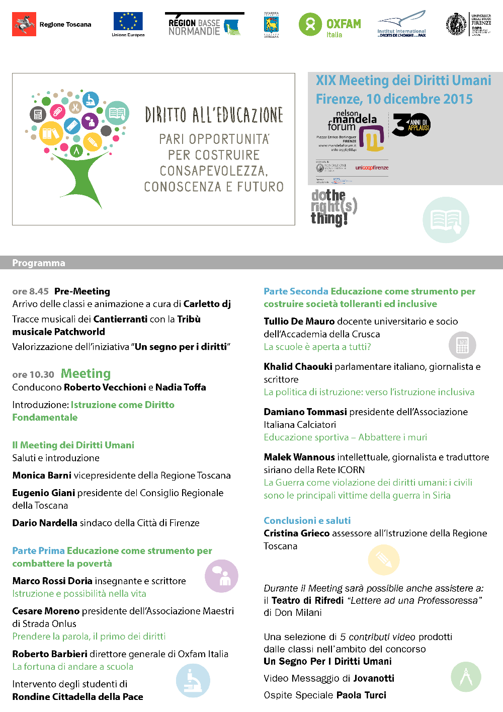 Un’ importante segnale di crescita ed apertura internazionale, per un evento nato a Firenze per iniziativa della Regione per celbrare l’anniversario della Dichiarazione universale dei diritti dell’uomo (avvenuta 67 anni fa) e che in diciannove anni ha visto la partecipazione di oltre 200 ospiti e più di 150 mila studenti. (vedi scheda sulla storia del meeting).